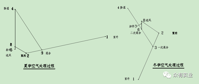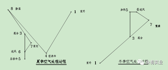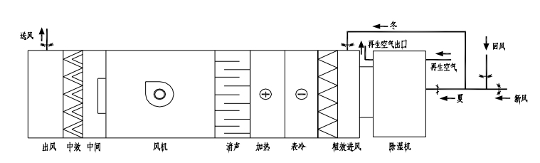 此系統(tǒng)中,夏季:溫度為 Tw 濕度為 RHw 的室外風(fēng)經(jīng)與室內(nèi)風(fēng)經(jīng)一次回風(fēng)混合后,達(dá)到某一狀態(tài)點(diǎn)3,進(jìn)入轉(zhuǎn)輪除濕機(jī),其出風(fēng)狀態(tài)點(diǎn)為 4(Rho 小于 4%,T 達(dá)到 43℃左右),然后再經(jīng)過(guò)表冷器干冷處理后達(dá)到狀態(tài)點(diǎn) 5,經(jīng)風(fēng)機(jī)溫升達(dá)到狀態(tài)點(diǎn) 6 后送入室內(nèi),以保證室內(nèi)狀態(tài)參數(shù) Tn,RHn。冬季:溫度為 Tw, 濕度為 RHw 的室外風(fēng)經(jīng)與室內(nèi)風(fēng)經(jīng)一次回風(fēng)混合后,達(dá)到某一狀態(tài)點(diǎn) 3,取一部分回風(fēng)進(jìn)入轉(zhuǎn)輪除濕機(jī),其出風(fēng)狀態(tài)點(diǎn)為 4(Rho 小于 4%,T 達(dá)到 43℃左右),再與未經(jīng)過(guò)除濕機(jī)的回風(fēng)經(jīng)二次回風(fēng)混合后達(dá)到混合點(diǎn) 6,然后經(jīng)蒸汽加熱器處理后達(dá)到狀態(tài)點(diǎn) 7,經(jīng)風(fēng)機(jī)溫升達(dá)到狀態(tài)點(diǎn) 8 后送入室內(nèi),以保證室內(nèi)狀態(tài)參數(shù) Tn,RHn。此類(lèi)系統(tǒng)可以提供 RHn=2%~30%的環(huán)境參數(shù),常用于濕度要求較高的系統(tǒng)。