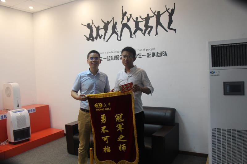 首先獎勵的是來公司僅僅4個月的銷售梁福華,在7月份炎炎夏日的高溫下不懼辛苦,勤勞務實主動見客戶,跑客業務、不言累、不畏險、始終堅定不移的做市場、做銷售、做客戶,功夫不負有心人,累水汗水與業績達成正比,梁工與一家公司一次性簽訂了53臺CFZ-8除濕機的大單,7月份總體銷售額高達36萬多,能攻下大單,難能可貴,充分展現出了一個優秀銷售員平時善于鉆研學習,沉心靜氣跑業務,不急不躁、不等不靠做業務的優秀品質,這樣的工作態度是我們每個人學習的榜樣。最后由郭總給梁工頒發錦旗并且給予了紅包獎勵。